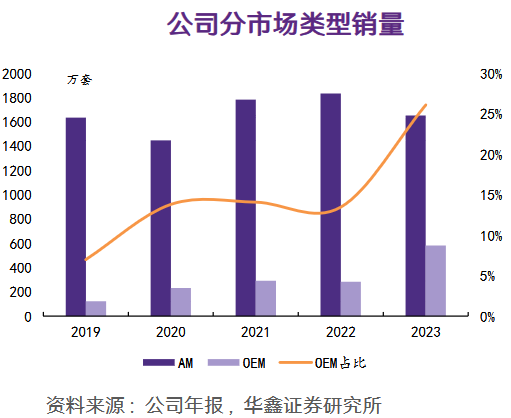 深耕汽车配件领域多年,雷迪克拥有丰富的售后市场和OEM配套经验。在国产化替代趋势不断加强的背景下,雷迪克积极调整客户结构,卡位新能源赛道,公司的售后市场(AM)业务和主机配套(OEM)业务都获得了快速发展。根据2023年年报数据,雷迪克AM市场实现销售1651.78万套,OEM市场实现销售582.46万套,并且OEM市场销售同比大幅增长104.54%。