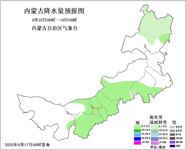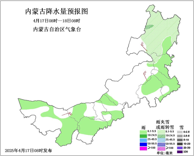 内蒙古气象台预计,今明两天(4月17日-18日),受冷空气影响,内蒙古多地气温下降4~6℃,部分地区降温6℃以上,局地降温超10℃,公众请根据天气变化,及时调整着装。同时,今明两天全区大部将出现降水天气,不过量级较小,主要以小雨或雨夹雪为主。另外,今后三天,内蒙古多地仍有大风天气出没,西部部分地区还伴有沙尘天气,请注意防范。
