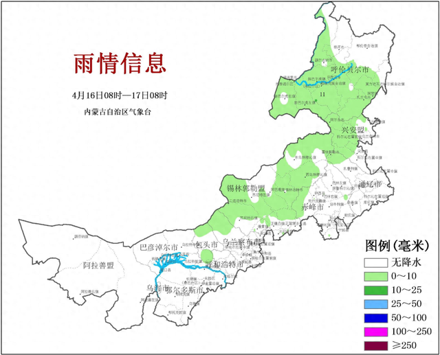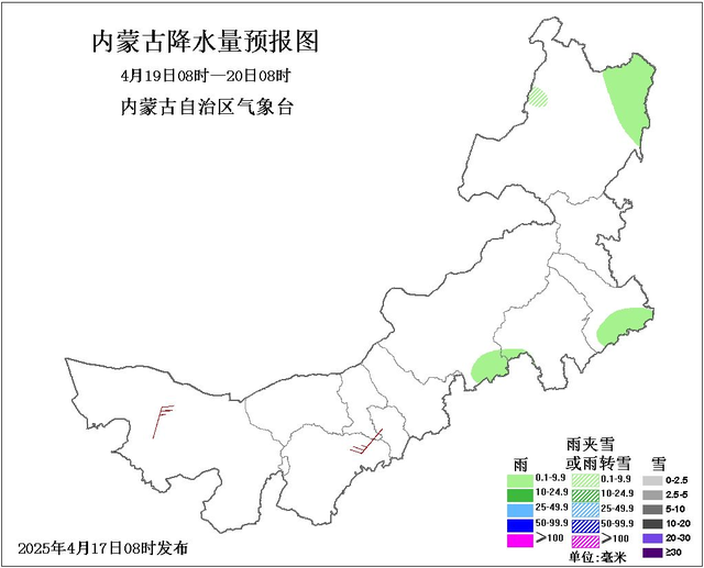 今天白天,受冷空气影响,全区大部地区将有降水天气出现,阿拉善盟东部和北部、巴彦淖尔市西部、乌海市、鄂尔多斯市大部、包头市北部部分地区、呼和浩特市北部偏北和南部、乌兰察布市西北部和南部、锡林郭勒盟西部偏西和东北部、赤峰市北部、通辽市大部、兴安盟大部、呼伦贝尔市大部有小雨或雨夹雪,局地有中雨或雨夹雪。明天,多地降水持续,阿拉善盟东南部、巴彦淖尔市东部、乌海市、鄂尔多斯市大部至锡林郭勒盟西部和南部、赤峰市南部、通辽市西南部、呼伦贝尔市北部有小雨或雨夹雪。19日,全区大部无降水,仅在锡林郭勒盟东南部、赤峰市西南部、通辽市南部、呼伦贝尔市东部和西北部有分散性小雨或雨夹雪。