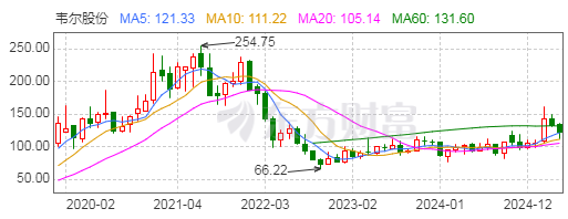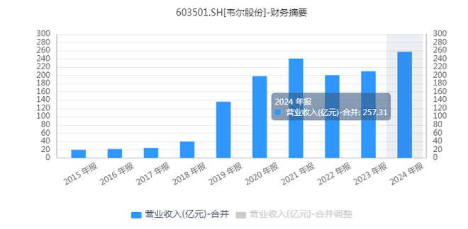 2024年,韦尔股份实现营业收入257.31亿元,较2023年增长22.41%,创下历史新高;实现归属于母公司股东的净利润为33.23亿元,较2023年增长498.11%。