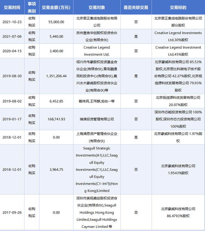 近年来,韦尔股份又陆续收购了知名芯片设计企业思比科、美国新思科技的亚洲TDDI业务、芯仑光电等,并以5.5亿元入股北京君正定增、收购了思睿博半导体等企业。