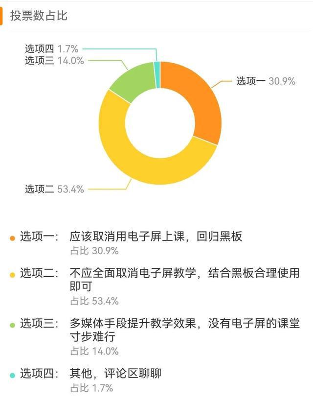 一项2829人参与的名为“学校是否应该取消电子屏教学”的投票显示,53.4%的网友认为“不应全面取消电子屏教学,结合黑板合理使用即可”,30.9%的网友认为“应该取消用电子屏上课,回归黑板”,14%的网友选择“多媒体手段提升教学效果,没有电子屏的课堂寸步难行”。