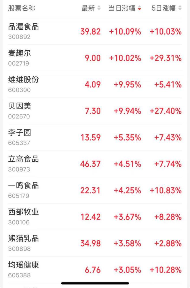根据同花顺数据,目前,A股乳业板块概念股共33只,近5日上涨股个数17只,麦趣尔、贝因美、品渥食品、一鸣食品涨幅居前。