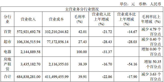 毛利率方面,国芳集团的百货、超市等业务毛利率分别为42.01%、27.43%,相比上年同期分别减少了4.79个百分点和0.40个百分点。需要说明的是,百货和超市等业务是国芳集团的主要收入来源,这些业务不仅收入下滑,毛利率也有所下降。
