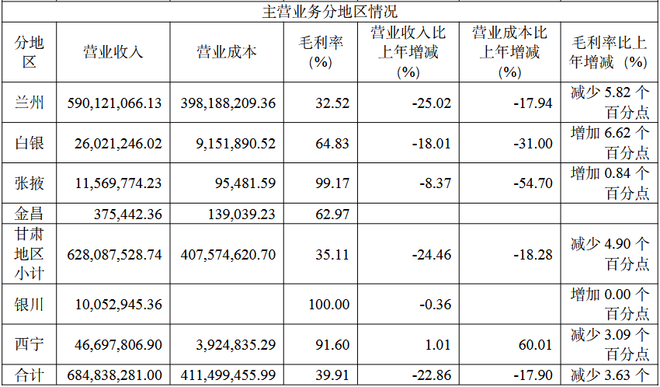 分地区来看,国芳集团虽然是西北地区的零售行业龙头,但其在甘肃主要地区,以及银川等地的营业收入也在下降。该公司在甘肃地区实现营收6.28亿元,同比下降24.46%;在银川实现营收1005.29万元,同比下降0.36%。