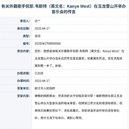 有网友线上咨询“侃耶·韦斯特(英文名:Kanye West)在玉龙雪山开举办音乐会的传言是否属实”,丽江市人民政府17日回复称:“经转丽江市文化和旅游局核实,该信息属实,目前该音乐会的举办还在审批中,预计五月下旬举办。”
