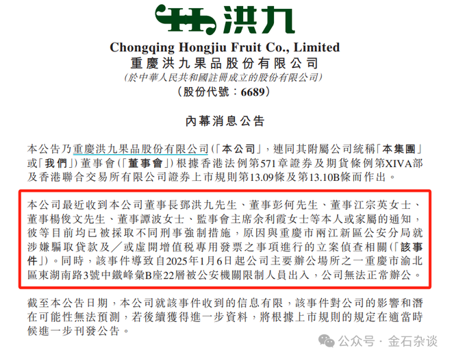 4月16日,洪九果品发布公告,公司董事长 邓洪九,董事彭何、江宗英、杨俊文、谭波及监事会主席余利霞等均已被采取不同刑事强制措施,原因是涉嫌骗取贷款及虚开增值税专用发票,涉及刑事,被立案调查。