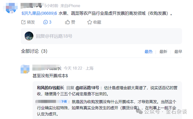 有股民表示,水果、蔬菜等农产品行业是虚开发票的高发领域,关键零成本。如果说百亿营收虚开三五亿不容易被发现,那你说洪九果品150亿左右的应收多少来自虚开发票?