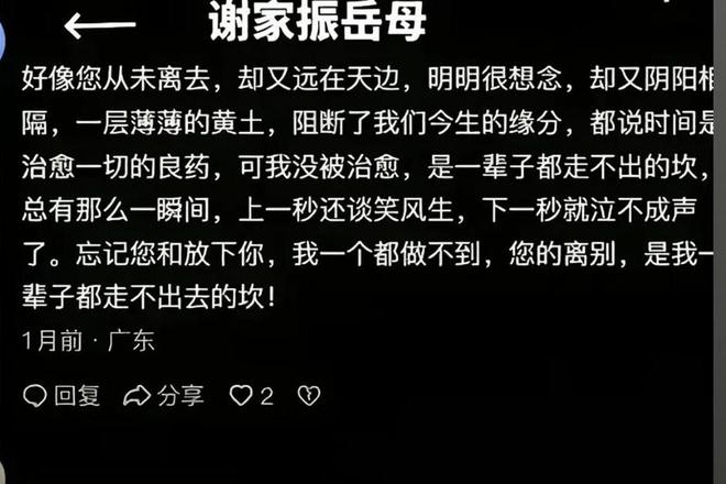 今天,谢家振的岳母在网络上发表了一段文字,用于吊唁自己的爱婿。这段文字是这样的: