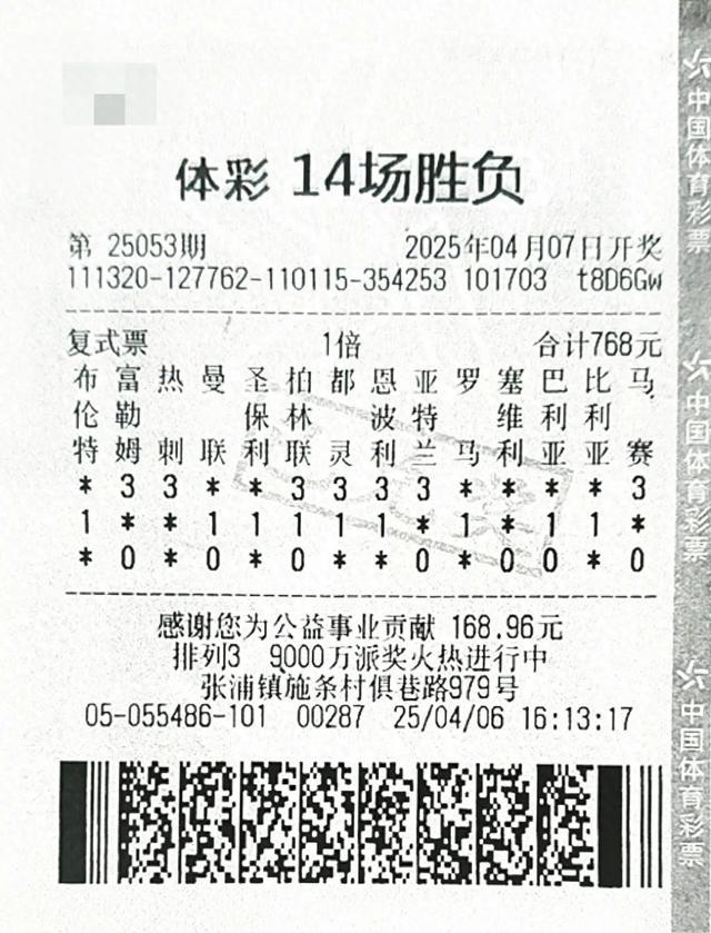 4月7日,中国体育彩票传统足彩14场胜负第25053期开奖,当期全国仅开出3注一等奖,单注奖金500万元。昆山张浦镇的彩友杨先生摘得其中1注一等奖,连同其它小奖,总奖金达到559万多元。