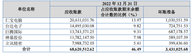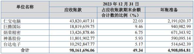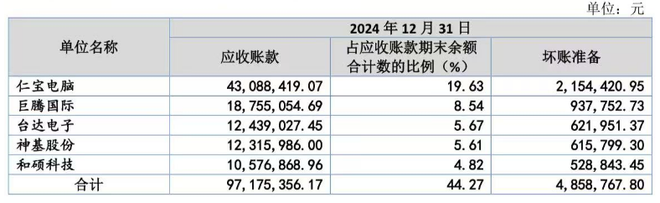 截至2024年末,公司对前五客户的应收账款为9717.54万元,占比44.27%,坏账准备485.88万元。其中,对仁宝电脑的应收账款为4308.84万元,占比19.63%、坏账准备215.44万元,占应收账款比例约5%。