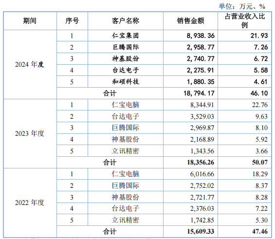 其中,仁宝电脑、巨腾国际等巨头占据绝对主导。2022年-2024年度,公司对仁宝电脑的销售收入占公司营业收入的比重分别为18.29%、22.76%和21.93%,同时,公司对巨腾国际、神基股份、立讯精密及康舒科技等客户的销售收入中,由仁宝电脑指定的功能性产品的销售收入占公司营业收入的比重分别为41.18%、35.93%和34.90%,总体占比较高。