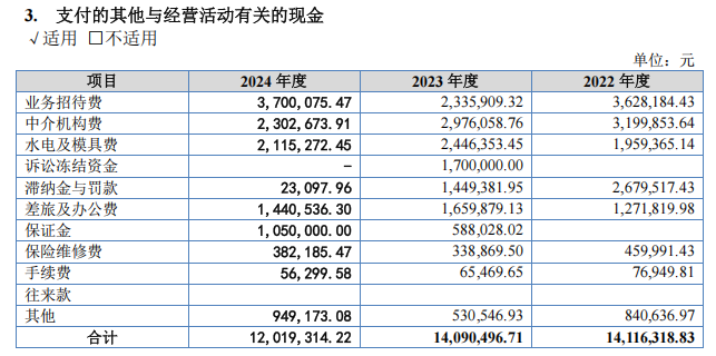 2022年度、2023年度和2024年度,公司支付的其他与经营活动有关的现金分别1,411.63万元、1,409.05万元和1,201.93万元。