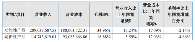 从产品结构看,公司功能性产品的销售占比分别为72.61%、70.14%和71.58%,毛利率分别为35.75%、37.10%和34.96%;防护性产品的销售占比分别为27.39%、29.86%和28.42%,毛利率分别为23.50%、23.54%和18.88%。
