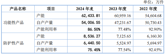 这也引发了市场对其新增产能无法完全消化的担忧。2022年度、2023年度和2024年度,公司功能性产品的产能利用率分别为92.90%、77.48%和86.50%,公司功能性产品产能利用率先下降后上升;防护性产品的产能利用率分别为92.45%、77.54%和75.45%,整体呈下降趋势。