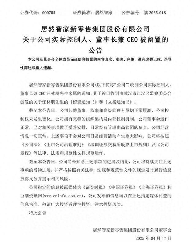 新快报讯 4月17日晚间,居然智家发布公告称,收到公司实际控制人、董事长兼CEO汪林朋先生家属的通知,其于近日收到由武汉市江汉区监察委员会签发的关于汪林朋先生的《留置通知书》和《立案通知书》。