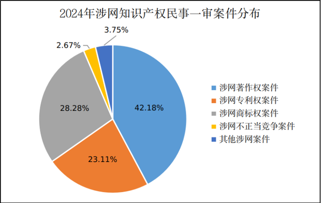 《2024年浙江知识产权司法保护分析报告》显示,从涉网案件类型看,著作权案件数量最多,共新收14094件,占涉网案件总收案量的42.18%,涉网不正当竞争案件893件,增幅最高,达46.70%。从涉网案件占各类案件的比重来看,涉网著作权案件占比最高,占著作权案件总数的81.42%;其次是涉网专利权案件,占专利权案件总数的80.10%。