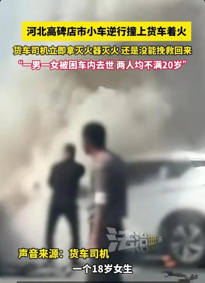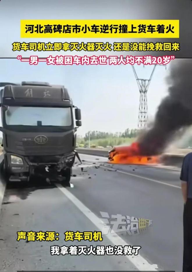 河北:小车逆行撞上大货车起火,一男一女被烧死,两人均不满20岁
