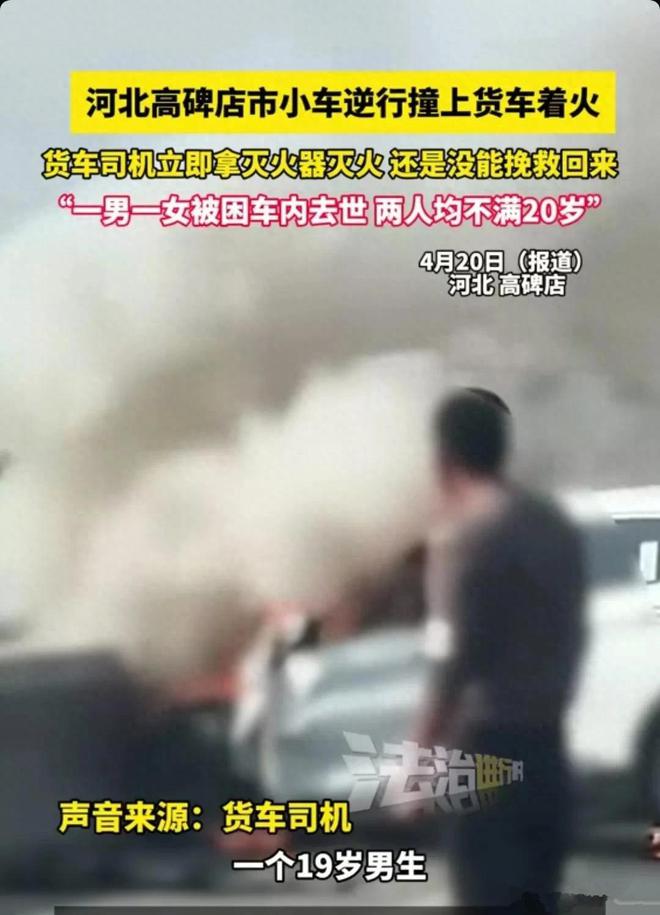 开车上路,本是奔向目的地,可总有人把马路当成了“生死赌局”。4月19日河北保定那场触目惊心的车祸,一辆白色小车毫无征兆地逆行,直直撞上正常行驶的大货车,瞬间燃起的大火,吞噬了两个年轻的生命——一个18岁的女生,一个19岁的男生,如花的年纪就此凋零。