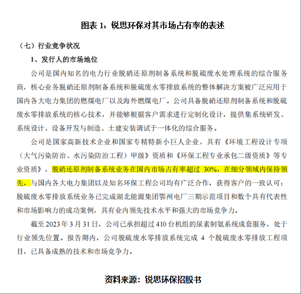 来源|时代商业研究院编辑|郑琳2021—2024年上半年,锐思环保部分财年的业绩增长得益于国家政策推动,其下游燃煤电厂脱硝还原剂制备系统改造需求激增。不过,随着改造进度的不断推进,该公司的核心业务增长动力或逐渐减弱。目前,锐思环保正冲刺北交所IPO,已于2023年9月27日递交申请材料并获受理,但尚未上会。其未来的上市前景备受市场关注。业绩受煤电行业政策影响起伏,核心产品市场规模或不足10亿元至于为何部分财年业绩实现增长,锐思环保在招股书中进行了解释,系燃煤电厂脱硝还原剂制备系统,以尿素水解制氨技术路径替代液氨的市场需求持续扩大。同时,根据锐思环保的第一轮问询回复,2021—2024年上半年,其来自改造市场的营收占比分别为82.11%、74.75%、88.25%、82.85%。报告期内,锐思环保七成以上的营收源自改造市场。同时,来自改造市场的营收占比变动趋势,也与其营收同比变动趋势较为一致。锐思环保在招股书中称,其主营产品脱硝还原剂制备系统在国内市场占有率超过30%。2022年,其脱硝还原剂制备系统产品的收入为2.57亿元。时代商业研究院以此计算,该产品的整个国内市场规模或仅为8.57亿元。根据博研咨询2024年12月16日发布的《中国SCR脱硝催化剂行业市场规模及投资前景预测分析报告》,2023年中国SCR(选择性催化还原)脱硝催化剂的市场总规模约180亿元人民币。下游燃煤电厂市场空间恐萎缩,2024年上半年新业务收入占比或不足 3%在招股书中,锐思环保称,其主要专注于燃煤电厂(以煤炭为燃料的火力发电厂)的脱硫、脱硝领域。因此,从锐思环保的下游产业链来看,其两大核心产品均受到燃煤电厂发展的影响。在“双碳”目标的强力推动下,减少煤炭使用量已经成为我国社会各界的共识,用新能源发电替代原有的火力发电也已在稳步推进。未来,若下游火电厂市场需求下滑,锐思环保的业绩能否保持增长存在不确定性。2021—2023年,锐思环保脱硫废水处理系统类产品的营收占比分别为14.25%、7.63%、23.02%。北交所问询脱硫废水处理系统产品订单获取情况,该业务的增长情况能否填补脱硝还原剂制备领域的业绩缺口。根据锐思环保的回答,脱硫废水处理系统产品在2024年上半年未有项目在当期实施完成。在新能源替代加速的背景下,锐思环保仍较为依赖燃煤电厂,且新的盈利增长点未见明显起色,其商业模式与业绩可持续性需重点关注。免责声明:本报告仅供时代商业研究院客户使用。本公司不因接收人收到本报告而视其为客户。本报告基于本公司认为可靠的、已公开的信息编制,但本公司对该等信息的准确性及完整性不作任何保证。本报告所载的意见、评估及预测仅反映报告发布当日的观点和判断。本公司不保证本报告所含信息保持在最新状态。本公司对本报告所含信息可在不发出通知的情形下做出修改,投资者应当自行关注相应的更新或修改。本公司力求报告内容客观、公正,但本报告所载的观点、结论和建议仅供参考,不构成所述证券的买卖出价或征价。该等观点、建议并未考虑到个别投资者的具体投资目的、财务状况以及特定需求,在任何时候均不构成对客户私人投资建议。投资者应当充分考虑自身特定状况,并完整理解和使用本报告内容,不应视本报告为做出投资决策的唯一因素。对依据或者使用本报告所造成的一切后果,本公司及作者均不承担任何法律责任。本公司及作者在自身所知情的范围内,与本报告所指的证券或投资标的不存在法律禁止的利害关系。在法律许可的情况下,本公司及其所属关联机构可能会持有报告中提到的公司所发行的证券头寸并进行交易,也可能为之提供或者争取提供投资银行、财务顾问或者金融产品等相关服务。本报告版权仅为本公司所有。未经本公司书面许可,任何机构或个人不得以翻版、复制、发表、引用或再次分发他人等任何形式侵犯本公司版权。如征得本公司同意进行引用、刊发的,需在允许的范围内使用,并注明出处为“时代商业研究院”,且不得对本报告进行任何有悖原意的引用、删节和修改。本公司保留追究相关责任的权利。所有本报告中使用的商标、服务标记及标记均为本公司的商标、服务标记及标记。