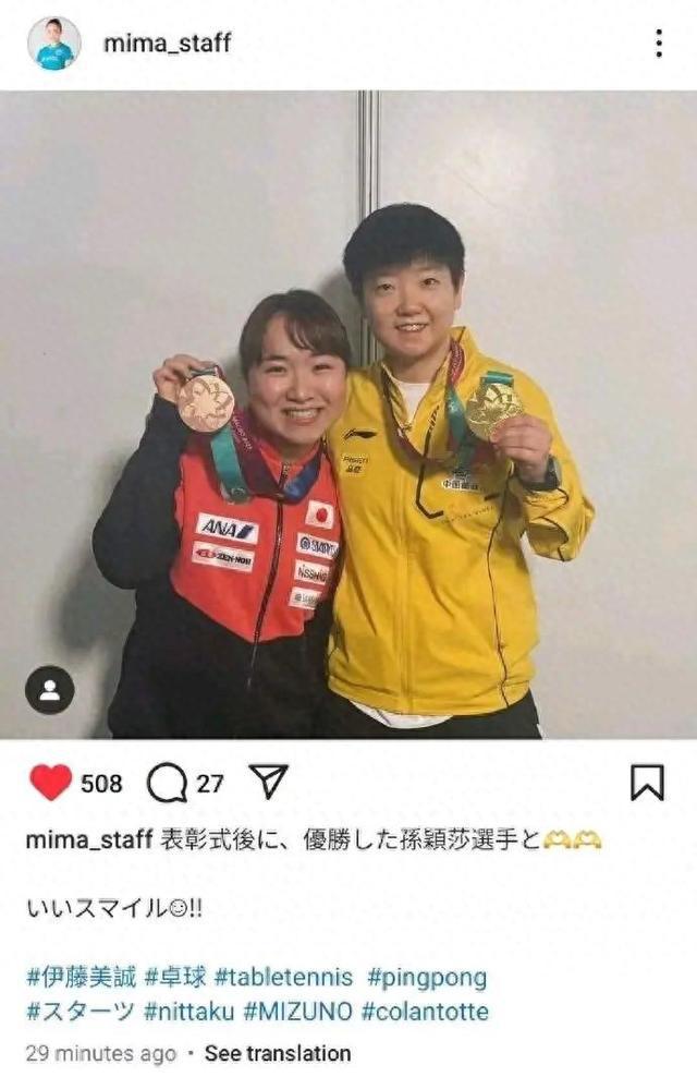 4月21日,日本乒乓球选手伊藤美诚更新社媒,晒出和孙颖莎的合照,并写道:“颁奖仪式后和冠军孙颖莎选手,漂亮的微笑”。