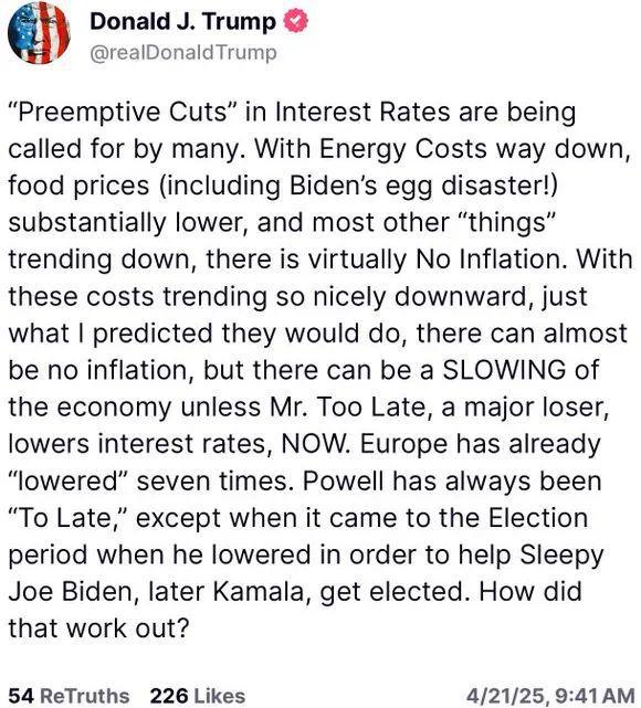 “鲍威尔总是‘迟到’,除了选举期间,他降息是为了帮助瞌睡乔(后来的卡玛拉)当选,”他写道。