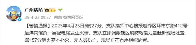 据@广州消防 通报,23日6时27分,支队指挥中心接报越秀区环市东路412号远洋宾馆负一层配电房发生火情,支队立即调派辖区消防救援力量赶赴现场处置。6时57分明火基本扑灭,无人员伤亡,现场正在有序组织处置。