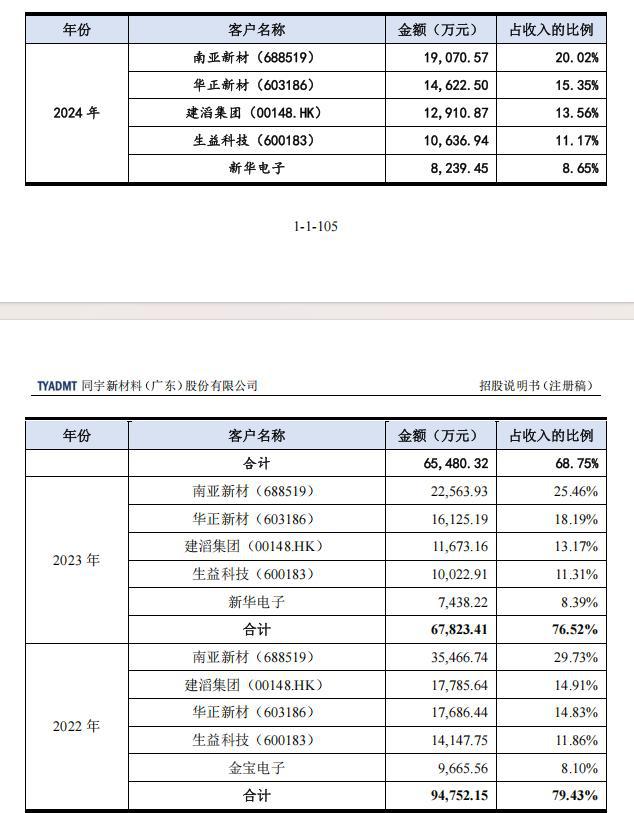 以大客户之一南亚新材为例,2022年同宇新材对其销售金额为35466.74万元,2023年降至22563.93万元,2024年再度降至19070.57万元。