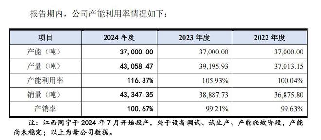 根据招股书,同宇新材总产能多年来保持在37000吨/年,但产量在逐年增加。2022年至2024年,同宇新材产能利用率分别为 100.04%、105.93%、116.37%,已达饱和状态,无法满足市场需求的增长,进而影响了业绩。