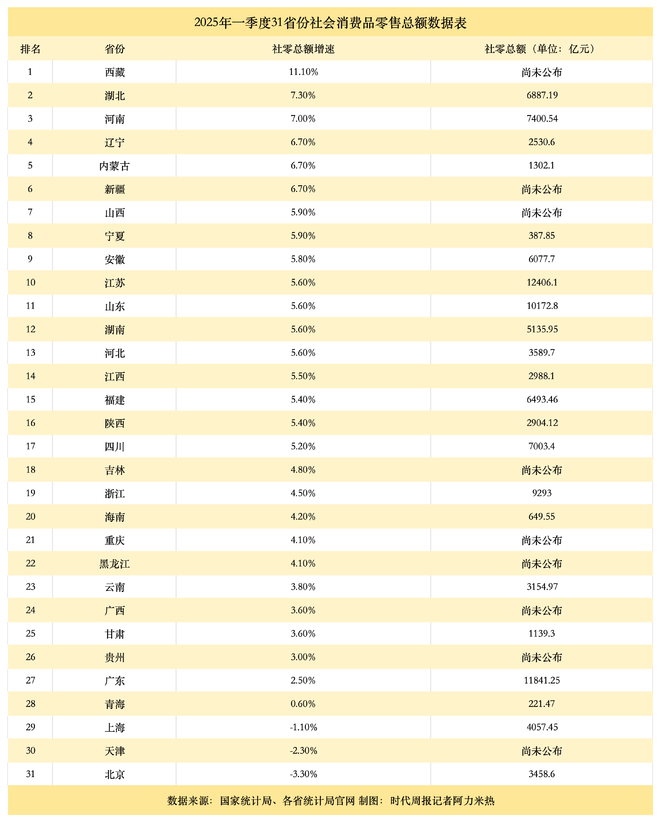 今年一季度,全国社会消费品零售总额(下称“社零总额”)达124671亿元,同比增长4.6%。最终消费支出拉动GDP增长2.8个百分点,贡献了一半以上的经济增长。国家统计局数据显示,在全国31个省份(不含港澳台)中,有28个省份的社零总额都是正增长,其中18个省份的增速跑赢全国均值。从社消零总额来看,截至发稿已有22个省份公布相关数据。作为头部经济大省,江苏和广东、山东一季度消零总额均突破万亿元,分别为1.24万亿元、1.18万亿元、1.01万亿元,暂居全国前三位。31个省份中,西藏以11.1%的社零总额增速名列榜首。这一亮眼表现,主要得益于西藏旅游业的快速复苏、城乡居民收入持续增长,以及铁路等重大基础设施建设的推进,西藏商贸流通体系不断完善,为消费市场注入了强劲动力。数据显示,截至4月初,西藏全区已使用补贴资金4722.03万元,实现消费品以旧换新64636笔,带动销售额2.83亿元。这其中,汽车、家电、家具以及手机等数码产品增长明显,对激发市场活力、提振消费信心发挥了重要作用。2025年春节期间,西藏累计接待国内外游客238.12万人次,同比增长16.56%,实现旅游总花费19.45亿元,同比增长13.68%。此外,餐饮、零售、旅游等重点领域消费需求旺盛,重点监测的35家商贸企业累计实现销售额达3859.17万元,同比增长7.79%。细分来看,湖北主要依靠服务性消费拉动,河南则通过以旧换新政策获得了红利。在文旅市场的火爆情形下,一季度,以文旅、数字消费为代表的教育文化娱乐支出同比增长15.5%,增速位居八大类生活消费支出之首。这其中,湖北文旅收入突破1200亿元,对消费增长的贡献率达到了35%。数据显示,在细分的消费类型中,今年1-3月,河南在通讯器材、家用电器和音像器材类领域消费增长显著,同比分别增长76.2%、33%,比上年同期加快42.9个和27.2个百分点。华东师范大学城市发展研究院院长曾刚在接受时代周报记者采访时表示,这些地区消费增速放缓主要受产业机构升级调整和外贸形势不明朗的影响。“此外,北京、上海等东部沿海省市是我国与进出口外经贸交流的主体,国际贸易形势的多变,干扰了东部地区经济的总体表现,导致企业、居民收入增长态势受到了一定影响,拉低了居民消费意愿。”曾刚说道。例如,《上海市提振消费专项行动方案》指出,要支持青年等重点群体就业,提高居民收入,着力减轻家庭“三育”、医疗、养老等负担。并加强财税优惠、金融支持、产业引导等政策协同,对内对外加强消费市场质量管理和品牌建设,加强文旅主题推介,提升服务感受度和消费便利度。从地区来看,今年一季度,中西部地区的消费市场表现尤为突出。从市场表现来看,原因也清晰可见。近年来,文化旅游业也逐渐成为我国中西部地区拉动消费的重要动力。从旅游热门城市长沙、武汉、重庆等,再到近年来因网络传播而红极一时的天水等三四线小城,越来越多中西部城市通过丰富的文化活动和美食,吸引了大量游客。除以上因素之外,人口结构优势也是推动中西部消费增长的重要原因。曾刚表示,中西部地区的中老龄化程度较低,劳动力群体比例较大,能够支持区域内的总收入增长。其次,年轻一代的消费观念更加开放,消费习惯与偏好趋向多样化,为消费市场的持续增长提供了有力支撑。而对于未来中西部地区的消费趋势,河海大学区域经济研究中心主任刘奇洪告诉时代周报记者,互联网营销打破了区域差异,使得中西部地区与东部地区处于相同起跑线。