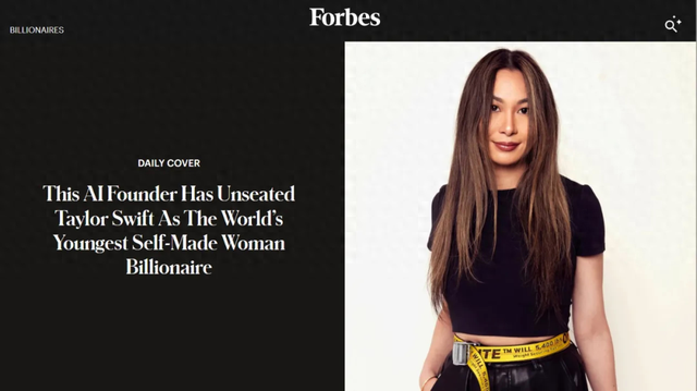 据《福布斯》报道,年仅30岁的人工智能初创公司Scale AI联合创始人郭露西(Lucy Guo)将超越美国歌手泰勒·斯威夫特(霉霉)成为全球最年轻的白手起家女性亿万富豪。