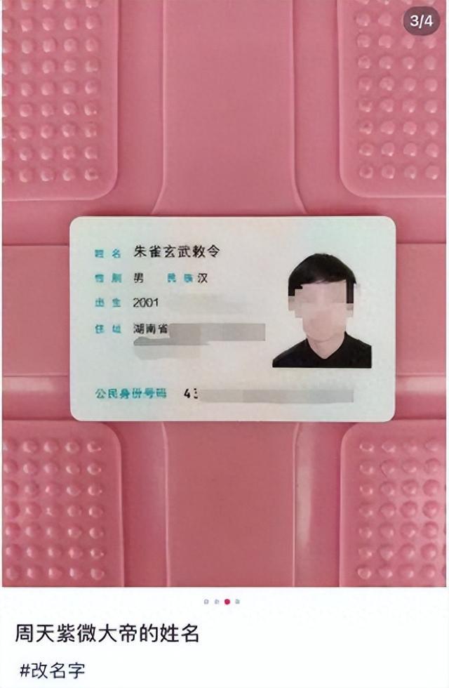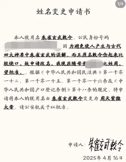 近日,有网友发帖称,自己现用名为“朱雀玄武敕令”,因该名易引发误解且拗口,申请随母姓并更名为“周天紫微大帝”,其公布了身份证及姓名变更申请书,引发热议。