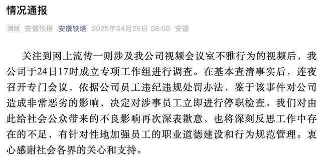 面对网上的热议,中国铁塔安徽分公司也没闲着。4月24日,也就是视频流传的当天,就发布声明说,已经关注到这个情况,第一时间成立了专项工作组进行调查。还说经过初步调查,视频里的场景确实是公司的某视频会议室,这种行为和企业价值观完全相悖,严重违反了员工行为规范和职业操守,会根据调查结果严肃处理,还道了歉。本以为这事儿调查需要点时间,没想到第二天,也就是4月25日,公司就发布了情况通报,说24日17点成立工作组,基本查清事实后,连夜开会,根据员工违纪违规处罚办法,因为事件影响太恶劣,决定对涉事员工立即停职检查,再次向公众道歉,还说会加强员工职业道德和行为规范管理。