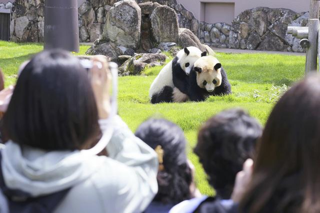 当地时间2022年4月11日,日本和歌山县白滨町的冒险世界游乐园,大熊猫“良浜”(右)与其女儿“枫浜”(左)玩耍。