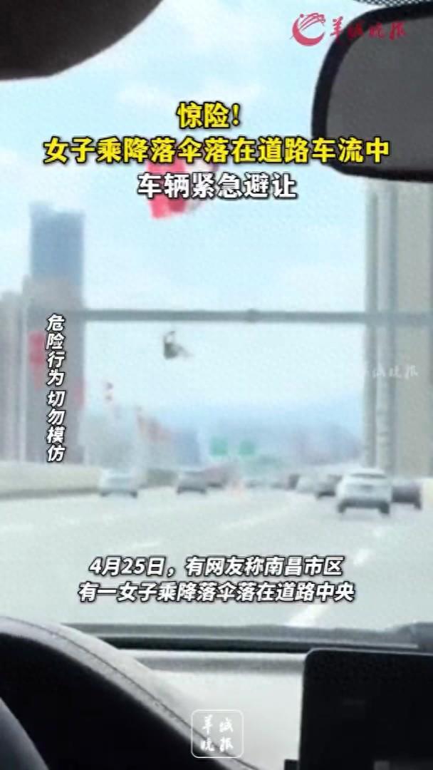 目击者表示,事件发生地点为南昌市朝阳大桥,时间为25日下午两点半左右,当时自己坐在车辆后排,看到前方有一女子身着降落伞缓缓落下。朝阳大桥桥下就是赣江江面,女子的行为十分危险,好在她抓住护栏停了下来,看起来并没有受伤。