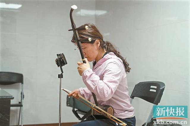 ■视障演员朱黎在化妆间里练习二胡。她在剧中的歌声空灵悠扬令人动容。