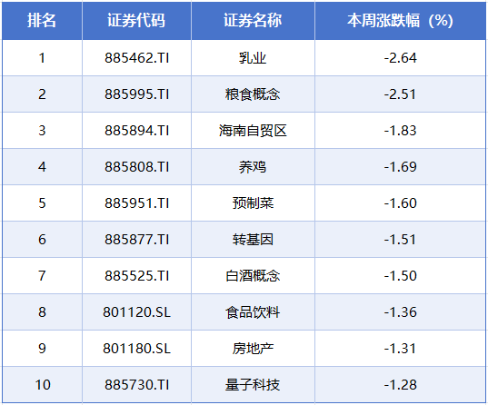 本周排在跌幅榜前排的概念板块分别是乳业、粮食概念、海南自贸区、养鸡、预制菜等板块,累计跌幅分别为2.64%、2.51%、1.83%、1.69%、1.6%。