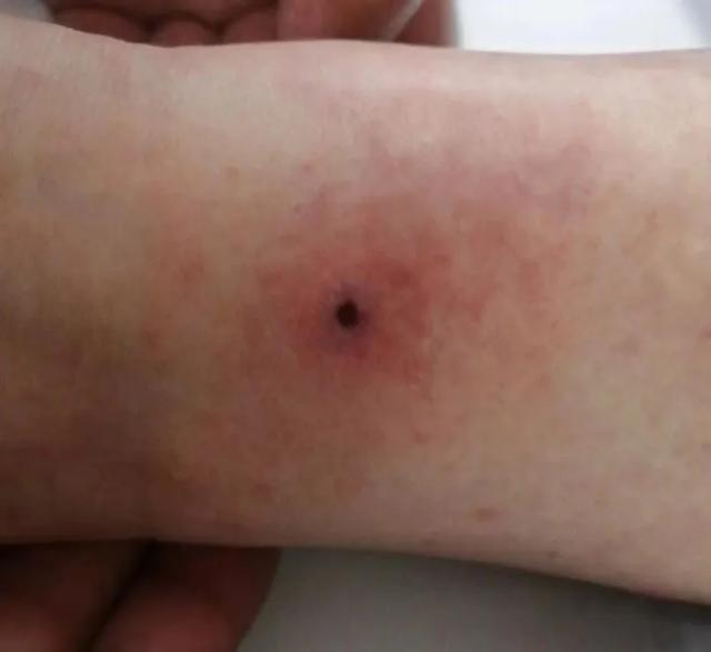 原来,医生在甄女士的右肩背部,发现了一个直径约1厘米的黑色焦痂,周围有红晕。这个不起眼的“小伤口”,成了诊断的关键线索。