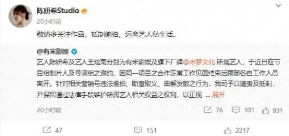 26日下午陈妍希方发澄清声明:一同聚餐的男子王炫南为同厂牌艺人,两人受节目组制片人及导演组邀约,工作见面结束后跟随各自工作人员离开,并抵制违法偷拍、断章取义、曲解发散之行为。