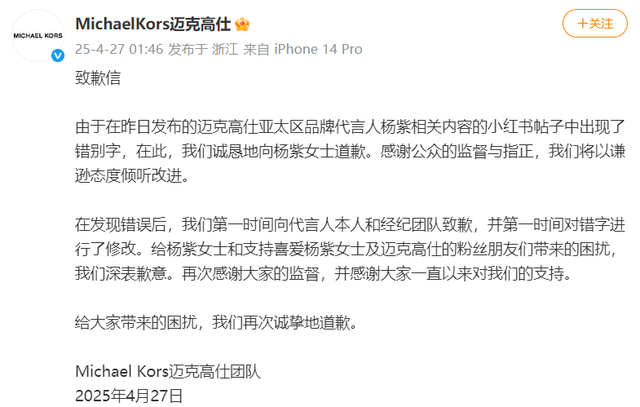 由于在昨日发布的迈克高仕亚太区品牌代言人杨紫相关内容的小红书帖子中出现了错别字,在此,我们诚恳地向杨紫女士道歉。感谢公众的监督与指正,我们将以谦逊态度倾听改进。