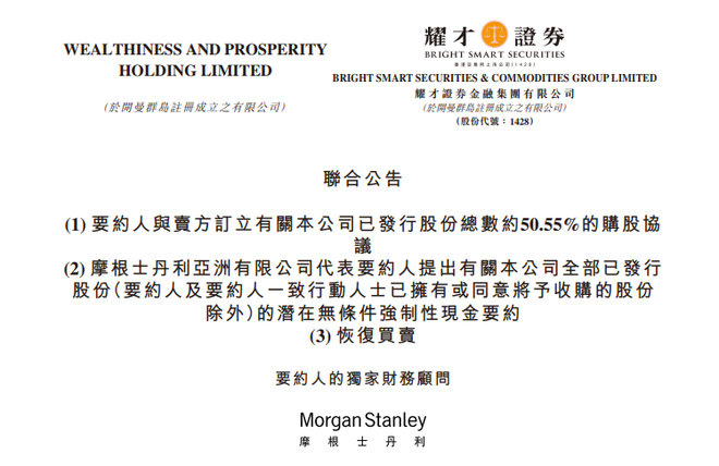 摩根士丹利为要约人的独家财务顾问。蚂蚁控股提出潜在无条件强制性现金要约,不过,蚂蚁控股一方表明冀要约截止后维持股份在联交所的上市地位。