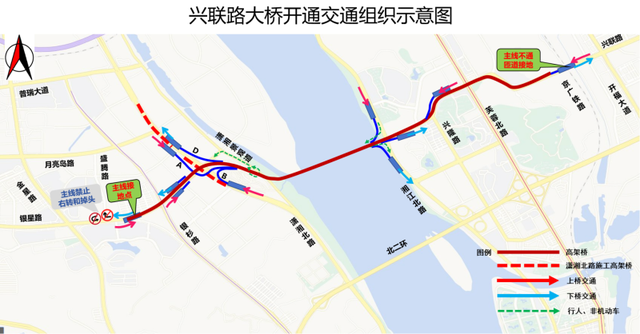 行人、非机动车经兴联路→湘江北路慢行坡道上桥。