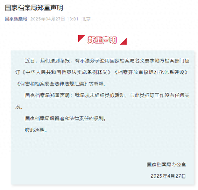 4月27日,国家档案局微信公众号发布声明称,国家档案局日前接到举报,有不法分子盗用国家档案局名义要求地方档案部门征订《中华人民共和国档案法实施条例释义》《档案开放审核标准化体系建设》《保密和档案安全法律法规汇编》等书籍。