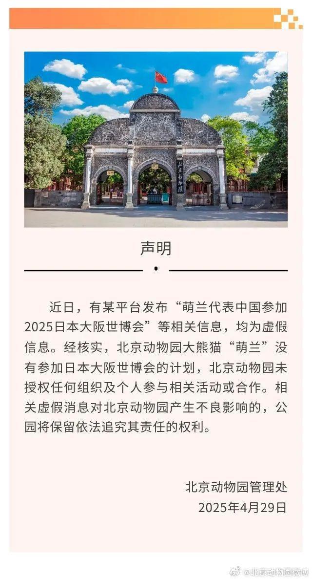 近日,有某平台发布“萌兰代表中国参加2025日本大阪世博会”等相关信息,均为虚假信息。经核实,北京动物园大熊猫“萌兰”没有参加日本大阪世博会的计划,北京动物园未授权任何组织及个人参与相关活动或合作。相关虚假消息对北京动物园产生不良影响的,公园将保留依法追究其责任的权利。