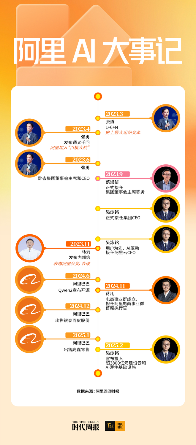 阿里巴巴(09988.HK)正式发布今年上半年最重要的AI大模型,成为第一个开源的混合推理模型。时代周报记者获悉,Qwen3历经7个月研发,内部称之为“一场封闭式推进”。而此次开源最大的意义,是将中国开源大模型的整体水平首次推向全球第一。此次亮相,马云为了阿里云新财年启动会而来。在现场演讲中,马云说:“高科技绝不仅是征服星辰大海,更应该呵护人间烟火。科技人员的责任,不是让 AI 取代人类,而是让 AI 更懂人类、更好地服务人类。”这些碎片式动作拼在一起,指向一个明牌的战略:阿里,正在All in AI。1999年,阿里提出“让天下没有难做的生意”,建立B2B网上贸易市场,连接中国供应商与全球采购商。2003年,淘宝上线,中小商户自此“上网”;2007年,大淘宝战略落地,中国电商生态第一次被系统性重构;2013年,阿里提出All in 无线,将商业体系彻底搬上移动端。为了这场转型,阿里已经铺陈了多年。新零售标签被撤下,高鑫、银泰相继退场,“1+6+N”变革出台,十八罗汉重返一线。在重构与试错中,阿里经历了动荡与阵痛,也付出了失速的代价,但它正试图以更清晰的战略主线归来。过去25年,阿里深刻参与并塑造了中国商业的技术路径与组织逻辑。如今,AI时代大幕已启,3800亿将如何重构这家互联网巨头公司?2017年3月,深圳IT领袖峰会会场内弥漫着一种难以言说的紧张与躁动。台上,马云一手握着话筒,另一只手习惯性地比划着。台下第一排,百度创始人李彦宏神情专注,腾讯董事会主席马化腾侧头凝神倾听。这是一次罕见的同框时刻。他们刚刚见证了AlphaGo击败世界顶尖围棋选手,引发全球轰动,人工智能正在从技术边界逼近现实边界。这句当时被视作“泼冷水”的评论,如今回看,更像是阿里AI战略的早期伏笔。在早期阶段,AI在技术层面稳步演进,但在阿里的整体叙事中依然处于背景层。与之相对的是,一场从业务到组织的危机逐渐浮现。在电商红利逐渐消退、对手崛起的背景下,阿里进入内外交困的至暗时刻。彼时,AI仍是技术部门的研究重点,但在全公司层面,主线尚未转向。2023年6月20日,阿里巴巴宣布蔡崇信出任集团董事会主席,吴泳铭出任CEO。蔡崇信在阐释“1+6+N”时曾公开表示:“我们不希望一个CEO每天做100件事,而是要把更多的权力交给前线团队。我们现在需要专注在两个业务:云计算和电商。”2024年4月,蔡崇信在接受外媒采访时直言:“过去几年,我们发现自己落后了,因为我们忘记了真正的客户是谁,没有给用户最好的体验。”至此,一条暗线浮出水面。方向已经确定,组织空间已经腾出,接下来的问题是:谁来真正推动AI战略的落地?2023年9月起,吴泳铭担任云智能集团董事长兼首席执行官,这意味着AI战略的执行中枢已然形成。此后,阿里快速进入AI执行周期。在不同时间点,阿里管理层持续接力,把这条战略线从幕后推向台前。钱怎么花?3800亿,3条路径搭建AI全家桶这句话也在阿里内部掀起不小震动。一位员工向时代周报记者坦言,如此大的投入力度“超出了预期”。这不仅是一场面向资本市场的信号释放,更是一次从内部出发的资源重排与战略宣言。吴泳铭的表态,被不少员工视为真正的总攻号角。这套组合拳,与蔡崇信在此前采访中的判断高度一致:“作为一家科技公司,我们相信机器智能会变得越来越聪明,因此开发了自己的大语言模型;同时,我们还有云计算业务,在全球范围内,同时具备领先的云计算与大模型业务的公司并不多;最后,我们有众多的垂直业务,如电子商务,这些业务都可深度应用AI技术。”作为AI战略的基石,基础设施投入是最底层的抓手,而芯片则是关键布局。基础设施的另一核心是人才。吴泳铭是出身技术,也是中国第一代程序员,如今重新掌舵集团并亲自管理云智能,本身就是这场重构的注脚。一位与阿里有合作的猎头告诉时代周报记者:“大模型领域现在人才很紧缺,阿里给出的薪资极具竞争力,核心技术工程师的年薪超过百万,基本要求都是在云计算、大数据及其行业应用上有落地经验。”截至今年3月,通义已开源大语言模型通义千问及视觉生成模型通义万相等共计200余款模型,覆盖从0.5B到110B等最全尺寸,Qwen模型下载量已经超过2亿,仅2024年在全球最大的AI开源社区HuggingFace中就占据其全球模型下载量的30%,高居第一。一个标志性事件是,2025年初,苹果公司宣布与阿里通义合作,将其模型接入中国区iPhone。“阿里有了苹果这个大客户,一方面可以将AI嵌入到苹果设备当中,嵌入更加多元的苹果APP当中,也能和苹果共同打造AI手机;另一方面,阿里有可能和苹果在数据学习上进行互动,以数据来训练通义千问,让AI更成熟,也增强阿里的数据优势。”盘和林补充称。“阿里还没到庆功的时候。”盘和林提醒,“国内依然有很多在AI领域的竞争对手,如今的人工智能商业模式也不够明朗,算力依然受限,要做的事还很多。”“未来三年可能是阿里集团历史上云的建设周期最大的、最集中的三年。”吴泳铭在财报会上表示,“我们相信这个集中的建设周期,对于我们硬件每年的摊销这些方面,会产生一定影响。但从我们现在看到的用户需求以及对行业未来的预判来看,我们觉得投入下去的整体基础设施,相信很快会被内外部的客户需求所消化。”为了推进AI战略,阿里进行了一场大刀阔斧的断舍离。2024年12月17日,阿里巴巴公告称,公司与另一名少数股东同意将