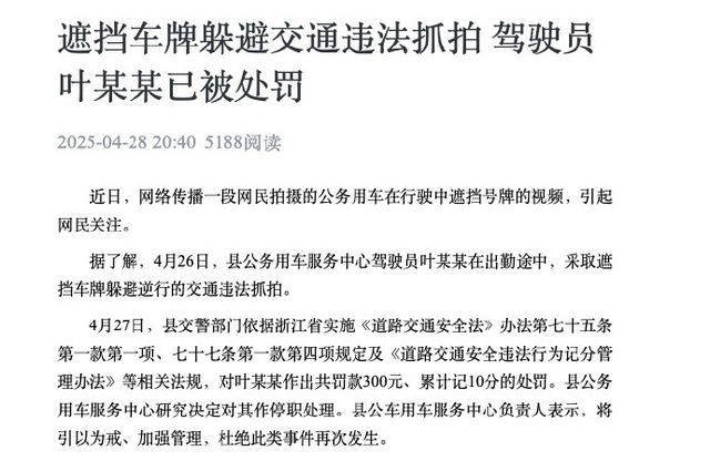 据了解,4月26日,县公务用车服务中心驾驶员叶某某在出勤途中,采取遮挡车牌躲避逆行的交通违法抓拍。