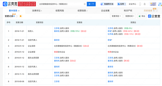 据企查查信息显示,该企业成立于2015年1月,注册资本600万,执行事务合伙人为蔡镭,董袭莹曾于2016年1月接任董晓辉法定代表人、股东角色,企业类型由普通合伙企业变更为有限合伙企业。2018年11月,董袭莹卸任相关职务。