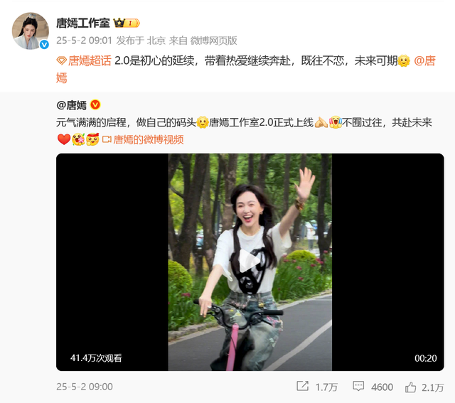随后,唐嫣工作室转发回应:“2.0是初心的延续,带着热爱继续奔赴,既往不恋,未来可期。”
