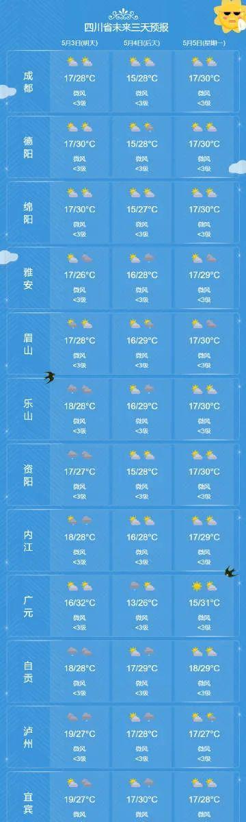 5月3日:多云,傍晚前后西部山区有分散阵雨,气温17~32℃;主城区,多云,气温19~31℃。