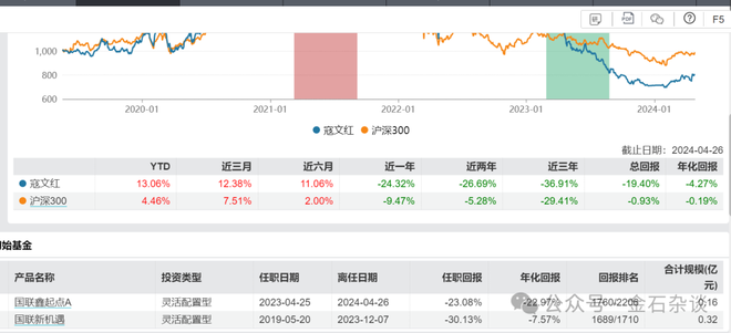 不过,寇总升职很快,管理规模一直在1亿规模以内打转,且业绩不忍直视。国联鑫机遇任职亏了超30%,国联鑫起点1年时间亏了23%。根据wind数据,寇文红近6个月盈利11%跑赢沪深300,但近1年亏损24%,近3年亏损36.9%,年化回报亏了4.27%。
